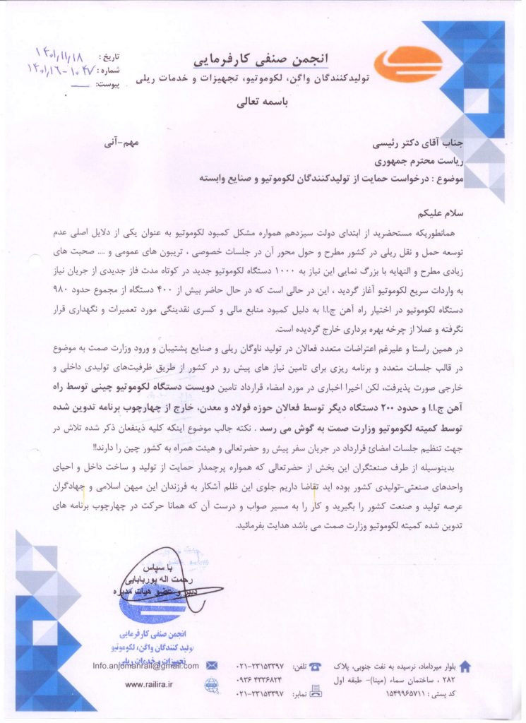اخبار انجمن مکاتبه با ریاست محترم جمهوری، جناب آقای دکتر رئیسی مارس 13, 2023 ارسال توسط railira-admin 13 مارس درخواست جهات حمایت از تولید کنندگان لکوموتیو و صنایع وابسته