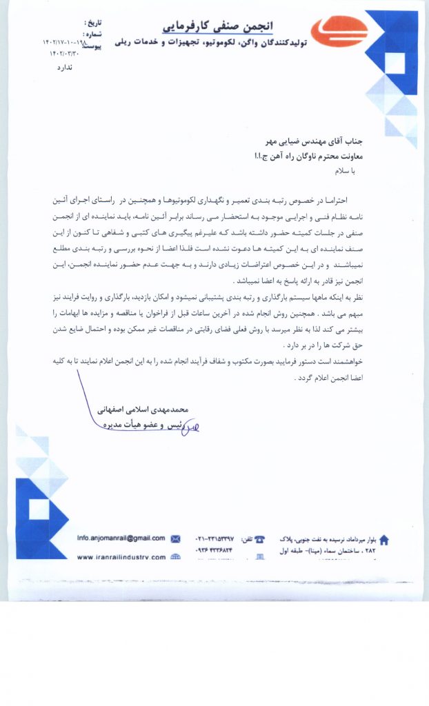اخبار انجمن مکاتبه با معاونت محترم ناوگان جمهوری اسلامی ایران (رتبه بندی تعمیر و نگهداری لکوموتیوها) ژوئن 25, 2023 ارسال توسط railira-admin 25 ژوئن